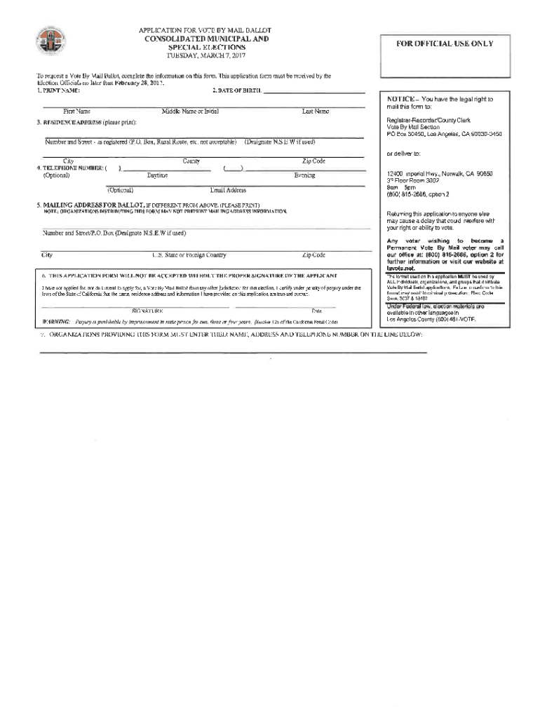 Application FOR VOTE BY MAIL BALTOTCONSOLIDATED MUNICIPAL AI) SPECIAL ELECTIONSFOROFFICIAL USE ONLYTUESDAY, MARCH 7,2017To request a Vote By Mail Ballot, complete the information on this form. This