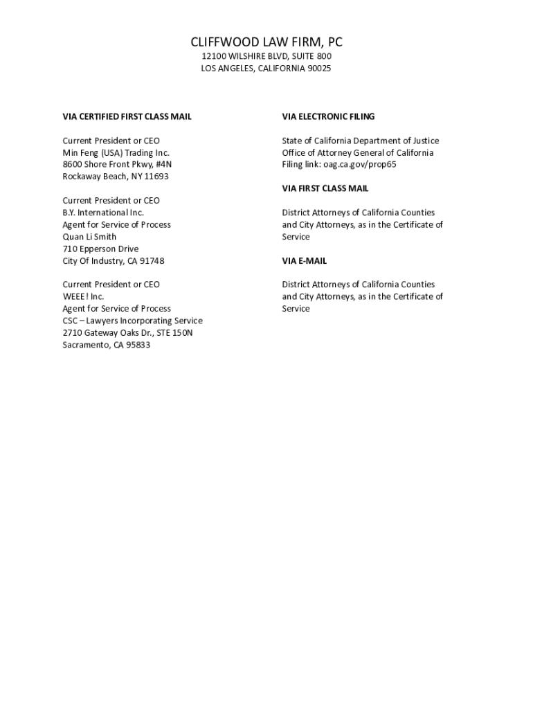 CLIFFORD LAW FIRM, PC 12100 WILSHIRE BLVD, SUITE 800 LOS ANGELES, CALIFORNIA 90025VIA CERTIFIED FIRST CLASS SILVIA ELECTRONIC FILINGCurrent President or CEO Min Fend (USA) Trading Inc. 8600 Shore