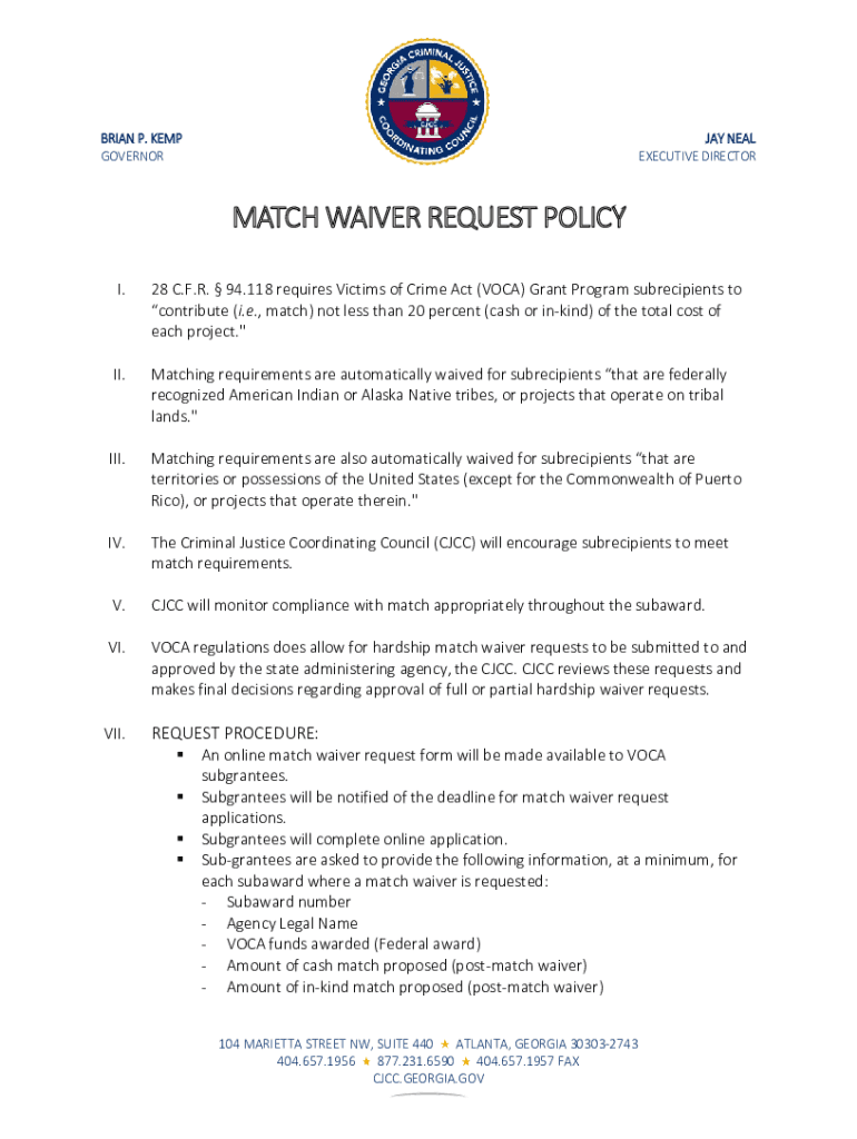 BRIAN P. KEMP GOVERNOR NEAL EXECUTIVE DIRECTORATE WAIVER REQUEST POLICY I.28 C.F.R. 94.118 requires Victims of Crime Act (VOCAL) Grant Program subrecipients to contribute (i.e., match) not less than