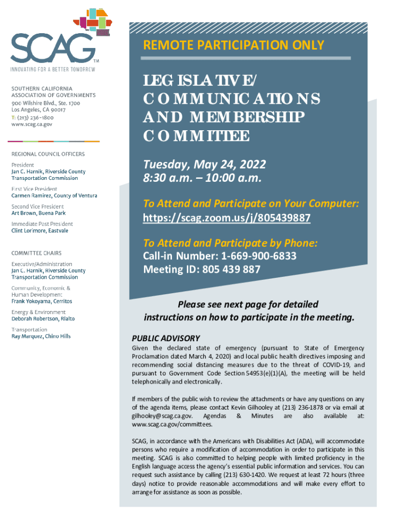 REMOTE PARTICIPATION ONLY SPECIAL MEETINGLEGISLATIVE/ COMMUNICATIONS AND MEMBERSHIP COMMITTEE Tuesday, May 24, 2022 8:30 a.m. 10:00 a.m. To Attend and Participate on Your Computer: https://scag.zoom.us/j/805439887