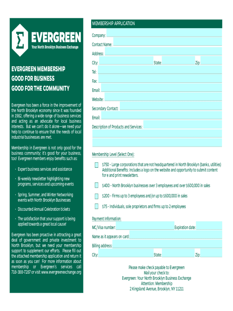 MEMBERSHIP APPLICATION Company: Contact Name: Address:EVERGREEN MEMBERSHIP GOOD FOR BUSINESS GOOD FOR THE COMMUNITY Evergreen has been a force in the improvement of the North Brooklyn economy since