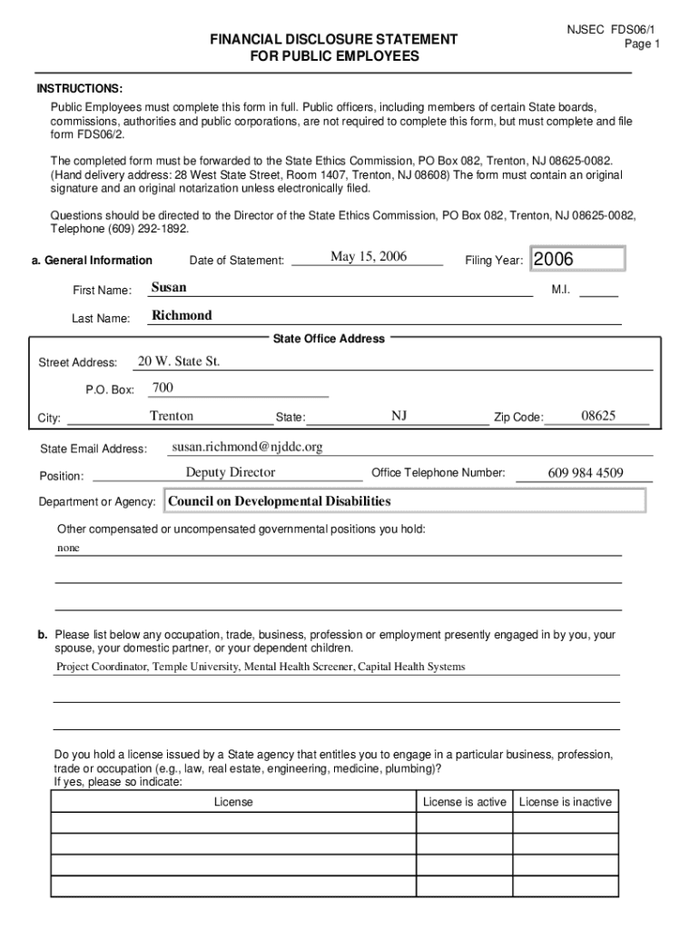 NJ SEC FDS06/1 Page 1FINANCIAL DISCLOSURE STATEMENT FOR PUBLIC EMPLOYEES INSTRUCTIONS:Public Employees must complete this form in full. Public officers, including members of certain State boards,