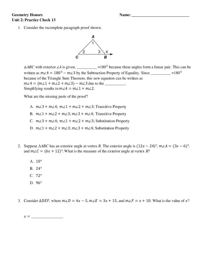 Geometry Honors Unit 2: Practice Check 13Name: ___1. Consider the incomplete paragraph proof shown. ABC with exterior 4 is given. ___ 180 because these angles form a linear pair. This can be written