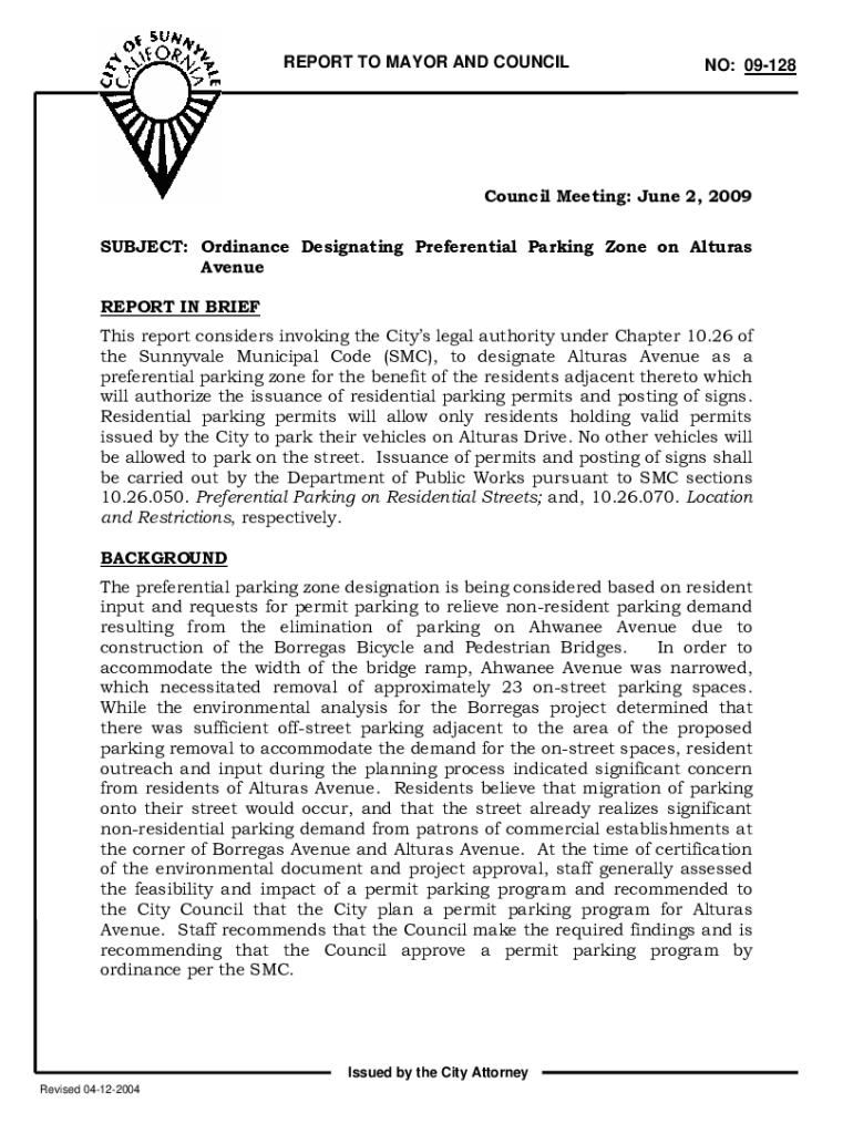 REPORT TO MAYOR AND COUNCIL NO: 09128Council Meeting: June 2, 2009, SUBJECT: Ordinance Designating Preferential Parking Zone on Altars Avenue REPORT IN BRIEF This report considers invoking the Cities