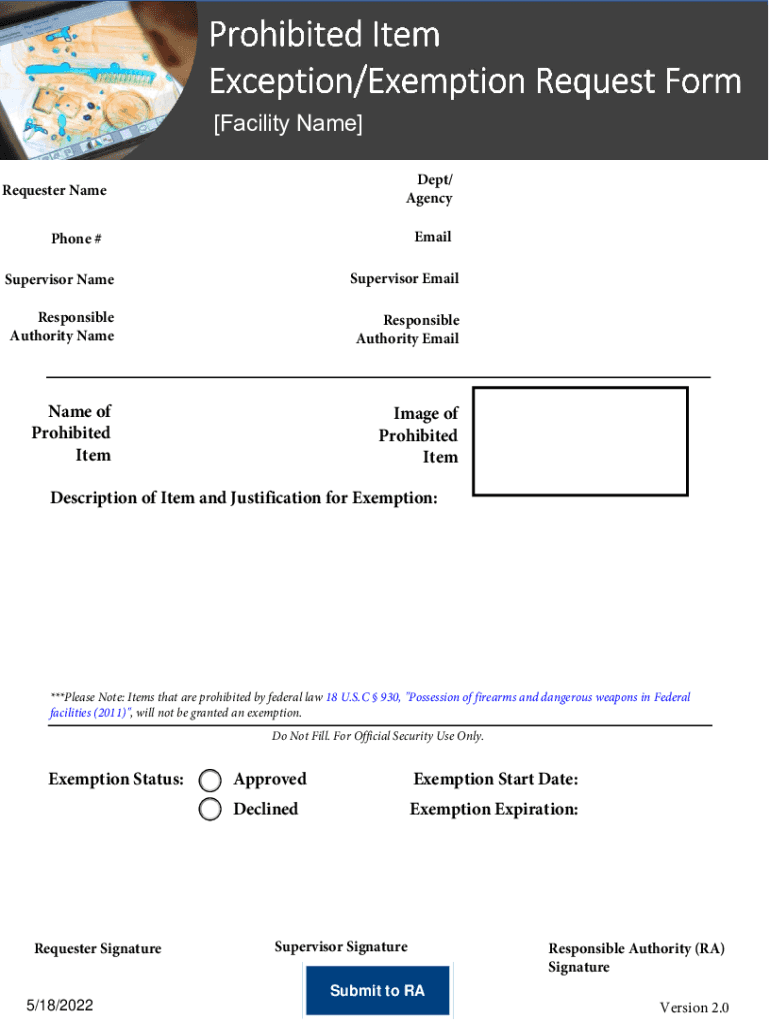 Get the free Prohibited Item Exception/Exemption Request Form 2022. Prohibited Item Exception/Exe...