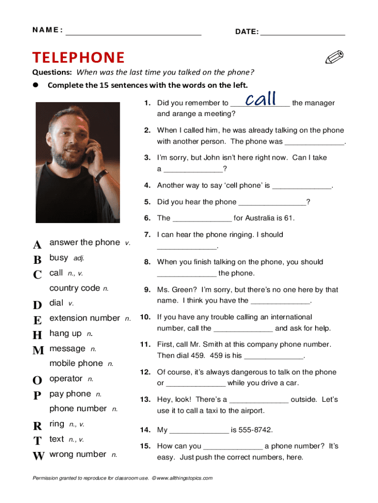 N A M E : ___DATE: ___TELEPHONE Questions: When was the last time you talked on the phone? Complete the 15 sentences with the words on the left. 1. Did you remember to ___ the manager and range a