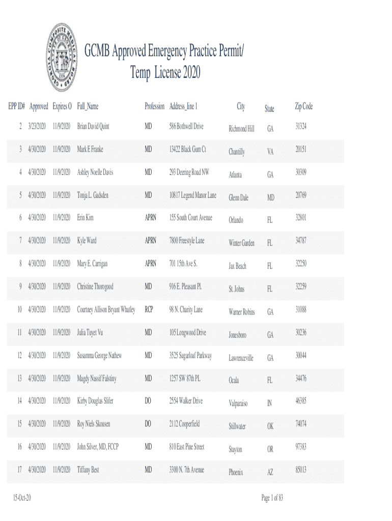 GCB Approved Emergency Practice Permit/ Temp License 2020 EPP ID#ApprovedExpires OFull_NameProfessionAddress_line 1CityState23/23/202011/9/2020Brian David QuintMD34/30/202011/9/2020Mark E Franke44/30/202011/9/202054/30/20206586