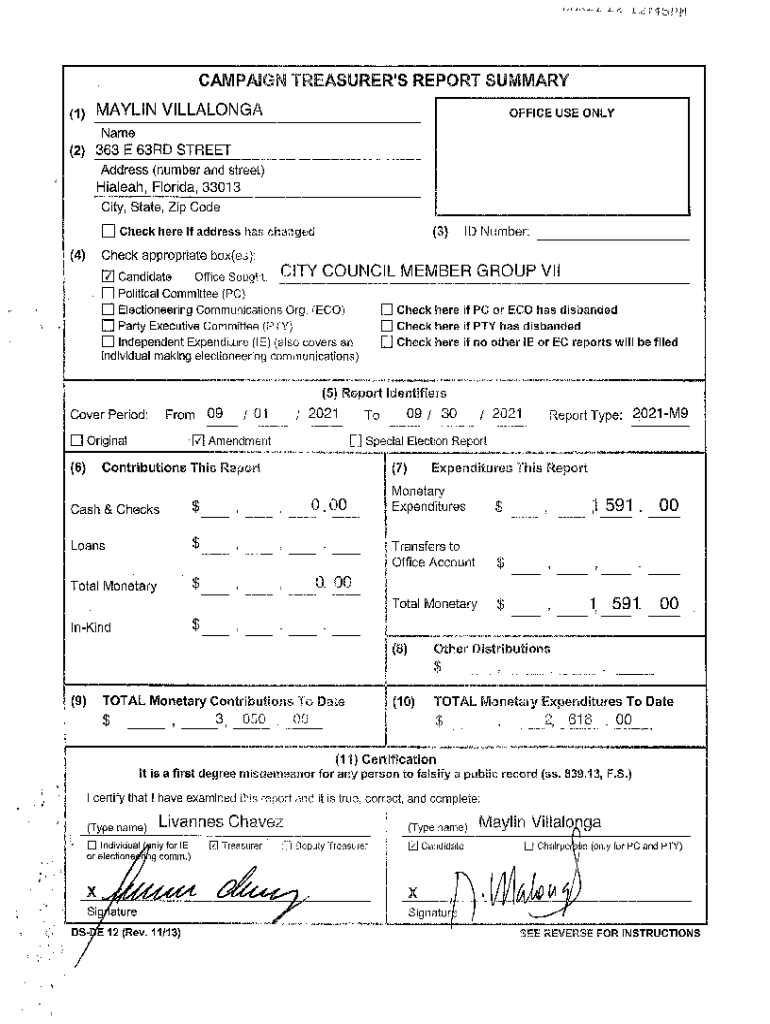 Campaign TREASURER\'S REPORT SUMMARY (1)MARLIN VILLALONGAOFFICE USE Online(2) 363 E 63RD STREET Address (number and street)Hialeah, Florida, 33013 City, State, Zip Coded (4)(3)Check here if address