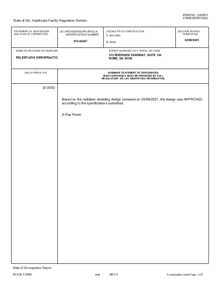 PRINTED: 3/9/2021 FORM APPROVEDState of GA, Healthcare Facility Regulation Division STATEMENT OF DEFICIENCIES AND PLAN OF CORRECTION(X1) PROVIDER/SUPPLIER/CIA IDENTIFICATION NUMBER:01042247(X2) MULTIPLE
