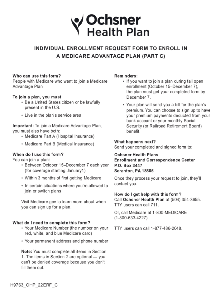 INDIVIDUAL ENROLLMENT REQUEST FORM TO ENROLL IN A MEDICARE ADVANTAGE PLAN (PART C)Who can use this form? People with Medicare who want to join a Medicare Advantage Plan To join a plan, you must:Be
