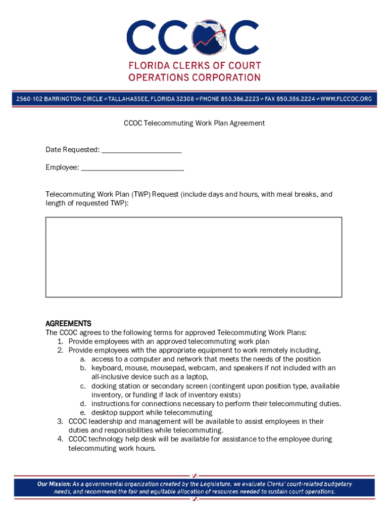 CCC Telecommuting Work Plan Agreement Date Requested: ___ Employee: ___ Telecommuting Work Plan (TWP) Request (include days and hours, with meal breaks, and length of requested TWP):AGREEMENTS The