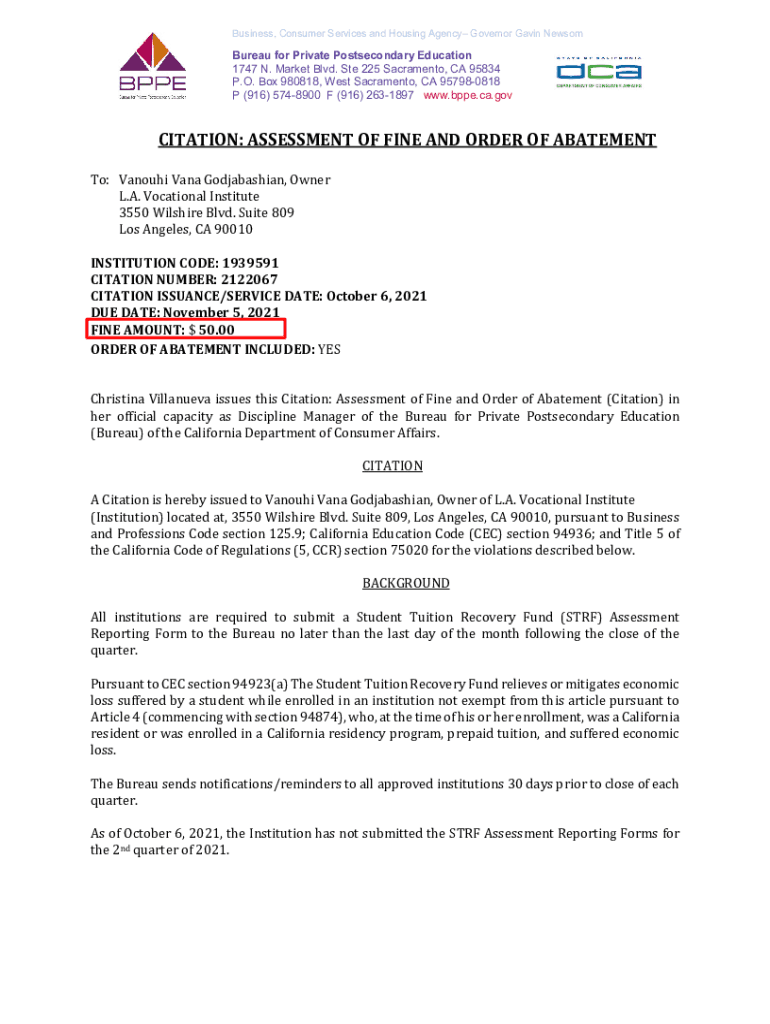 Get the free Bureau for Private Postsecondary Education - LA Vocational Institute - Assessment of...
