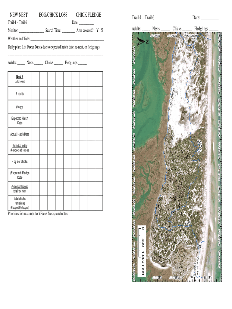 NEW NESTING/CHICK Constrain 4 Trail 6CHICK FLEDGED ate: ___Monitor: ___ Search Time: ___ Area covered? Y Weather and Tide: ___ Daily plan: List Focus Nests due to expected hatch date, retest, or fledglings___