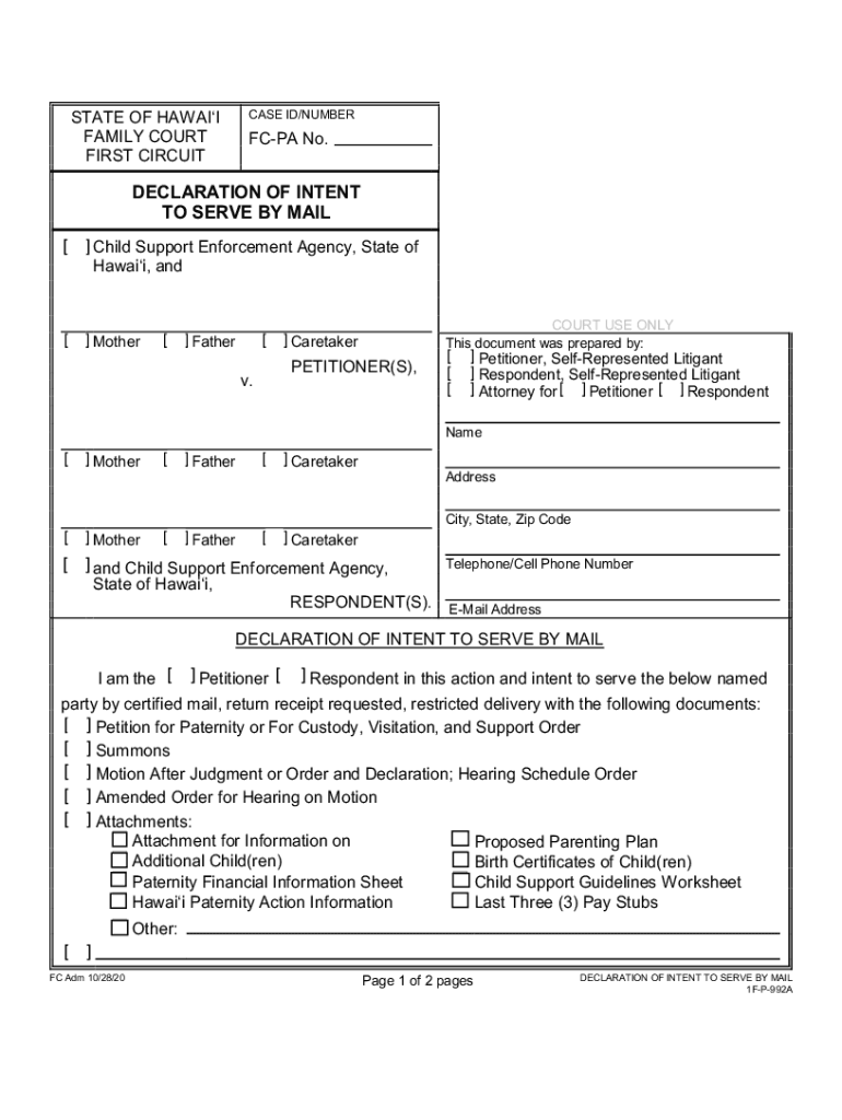 STATE OF HAWAII FAMILY COURT FIRST CIRCUIT CASE ID/NUMBERFCPA No. DECLARATION OF INTENT TO SERVE BY MAIL [] Child Support Enforcement Agency, State of Hawaii, and[] Mother[] Father[COURT USE ONLY