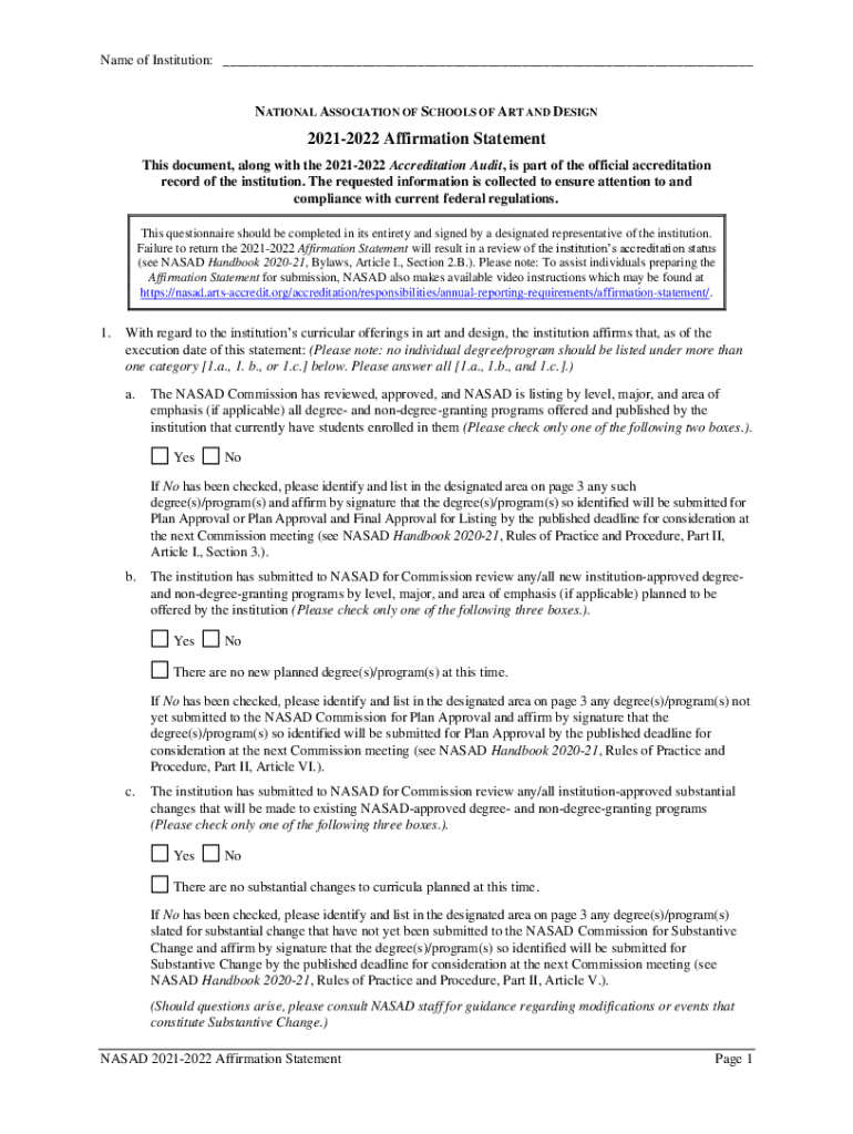 Name of Institution: ___NATIONAL ASSOCIATION OF SCHOOLS OF ART AND DESIGN20212022 Affirmation Statement This document, along with the 20212022 Accreditation Audit, is part of the official accreditation