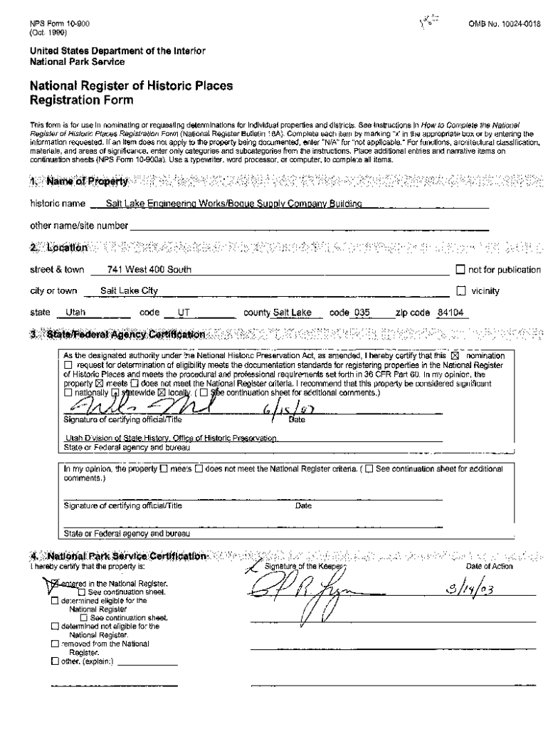 NFS Form 10900 (Oct. 1990)V×OMB No. 100240018United States Department of the Interior National Park ServiceNational Register of Historic Places Registration Form This form is for use in nominating