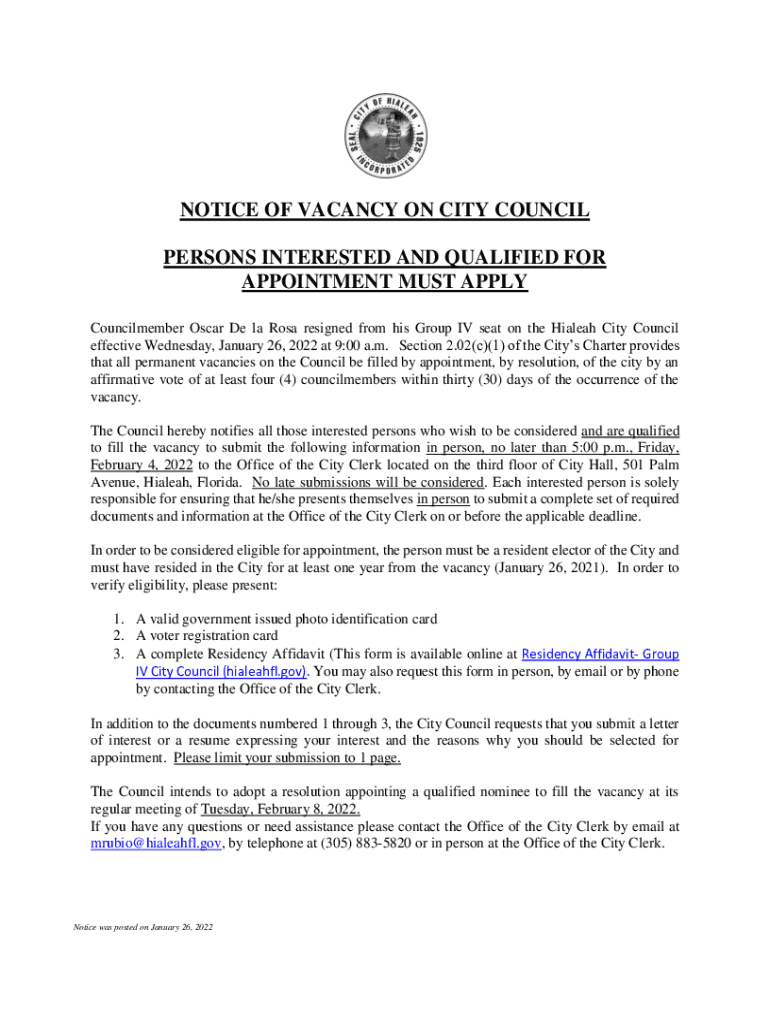 NOTICE OF VACANCY ON CITY COUNCIL PERSONS INTERESTED AND QUALIFIED FOR APPOINTMENT MUST APPLY Council member Oscar De la Rosa resigned from his Group IV seat on the Hialeah City Council effective