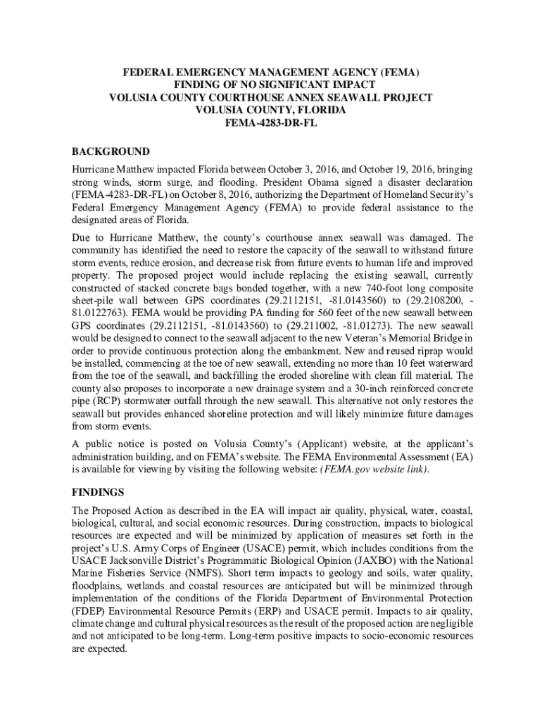 FEDERAL EMERGENCY MANAGEMENT AGENCY (FEMA) FINDING OF NO SIGNIFICANT IMPACT VOLUSIA COUNTY COURTHOUSE ANNEX SEAWALL PROJECT VOLUSIA COUNTY, FLORIDA FEMA4283DRFL BACKGROUND Hurricane Matthew impacted