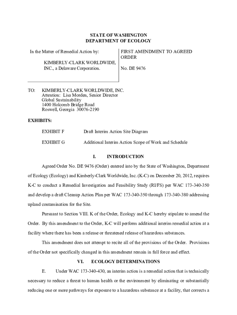 STATE OF WASHINGTON DEPARTMENT OF ECOLOGY In the Matter of Remedial Action by:FIRST AMENDMENT TO AGREED ORDERKIMBERLYCLARK WORLDWIDE, INC., a Delaware Corporation.TO:No. DE 9476KIMBERLYCLARK WORLDWIDE,