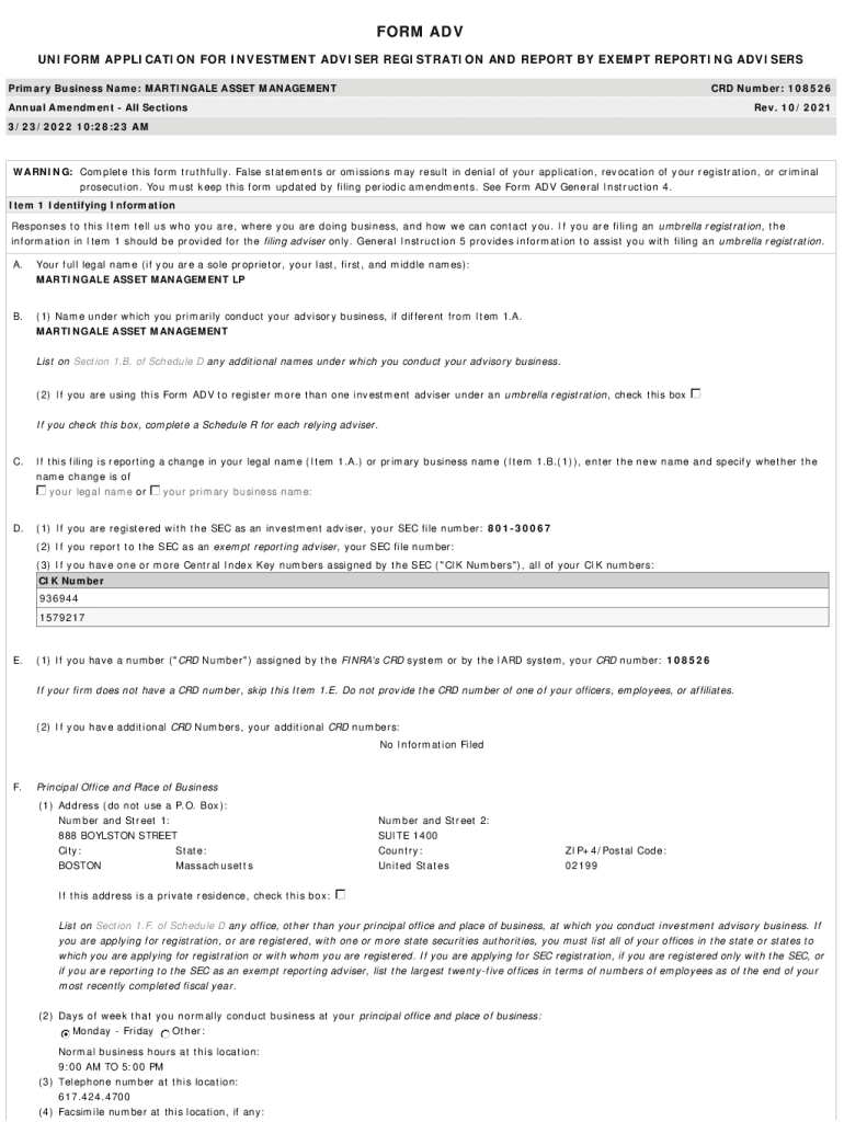 FORM ADV UNIFORM APPLICATION FOR INVESTMENT ADVISER REGISTRATION AND REPORT BY EXEMPT REPORTING ADVISERS Primary Business Name: MARTINGALE ASSET MANAGEMENT CRD Number: 108526Annual Amendment All Sections