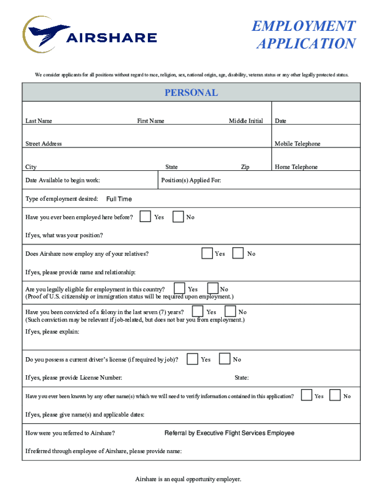 EMPLOYMENT APPLICATION We consider applicants for all positions without regard to race, religion, sex, national origin, age, disability, veteran status or any other legally protected status. PERSONAL