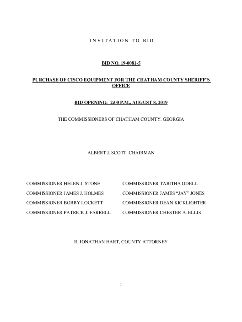INVITATION TO BID NO. 1900815 PURCHASE OF CISCO EQUIPMENT FOR THE CHATHAM COUNTY SHERIFFS OFFICE BID OPENING: 2:00 P.M., AUGUST 8, 2019THE COMMISSIONERS OF CHATHAM COUNTY, GEORGIAALBERT J. SCOTT,