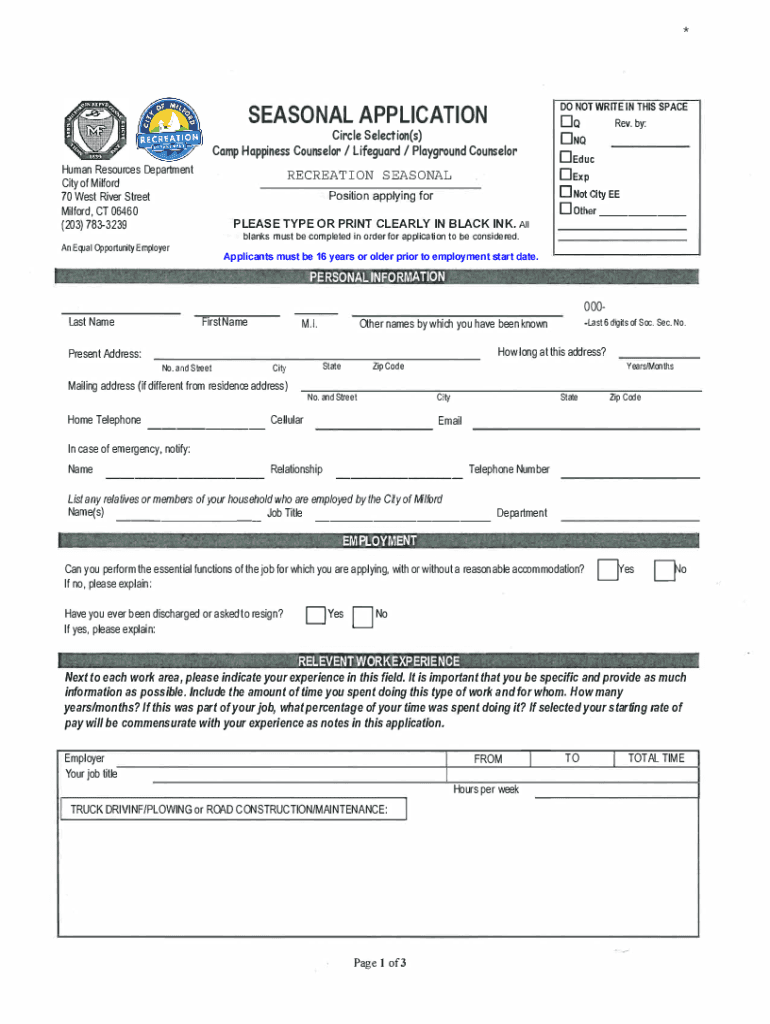 *SEASONAL APPLICATION RECREATION SEASONAL Not City Deposition applying release TYPE OR PRINT CLEARLY IN BLACK INK. Another blanks must be completed in order for application to be considered. An Equal