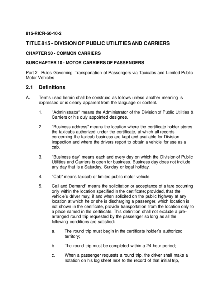 815RICR50102TITLE 815 DIVISION OF PUBLIC UTILITIES AND CARRIERS CHAPTER 50 COMMON CARRIERS SUBCHAPTER 10 MOTOR CARRIERS OF PASSENGERS Part 2 Rules Governing Transportation of Passengers via Taxicabs