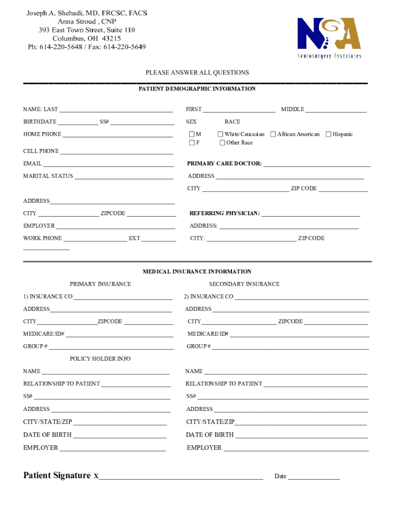 ___ PATIENT DEMOGRAPHIC INFORMATION NAME: LAST ___FIRST ___BIRTHDATE ___ SS# ___EXHUME PHONE ___ CELL PHONE ___ EMAIL ___ MARITAL STATUS ___ MF MIDDLE ___RACE White/Caucasian Other Race African American