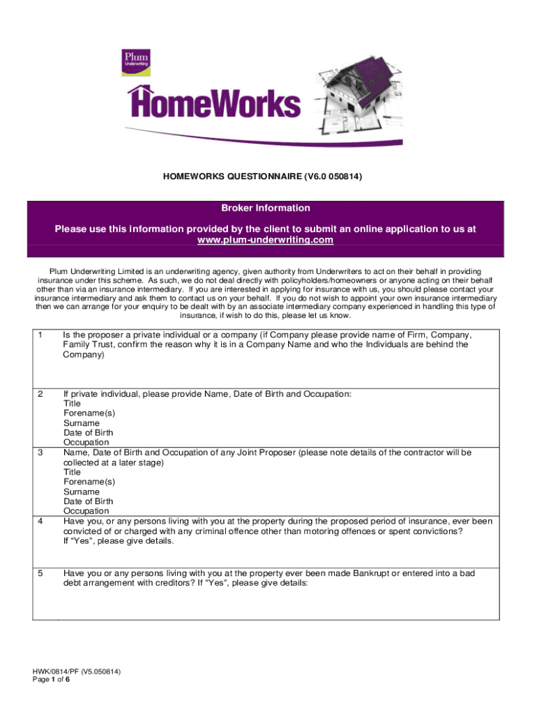 HOMEWORK QUESTIONNAIRE (V6.0 050814)Broker Information Please use this information provided by the client to submit an online application to us at www.plumunderwriting.comPlum Underwriting Limited