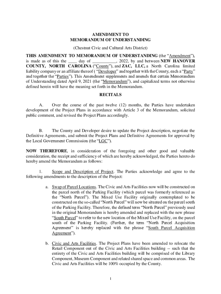 AMENDMENT TO MEMORANDUM OF UNDERSTANDING (Chestnut Civic and Cultural Arts District) THIS AMENDMENT TO MEMORANDUM OF UNDERSTANDING (the Amendment), is made as of this the ___ day of ___, 2022, by