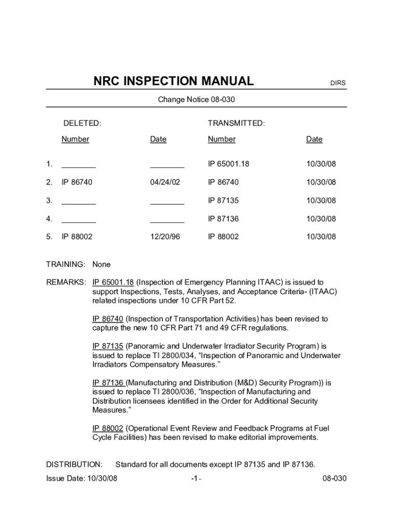 NRC INSPECTION MANUALDIRSChange Notice 08030 DELETED:TRANSMITTED:NumberDateNumberDate1.______IP 65001.1810/30/082.IP 8674004/24/02IP 8674010/30/083.______IP 8713510/30/084.______IP 8713610/30/085.IP