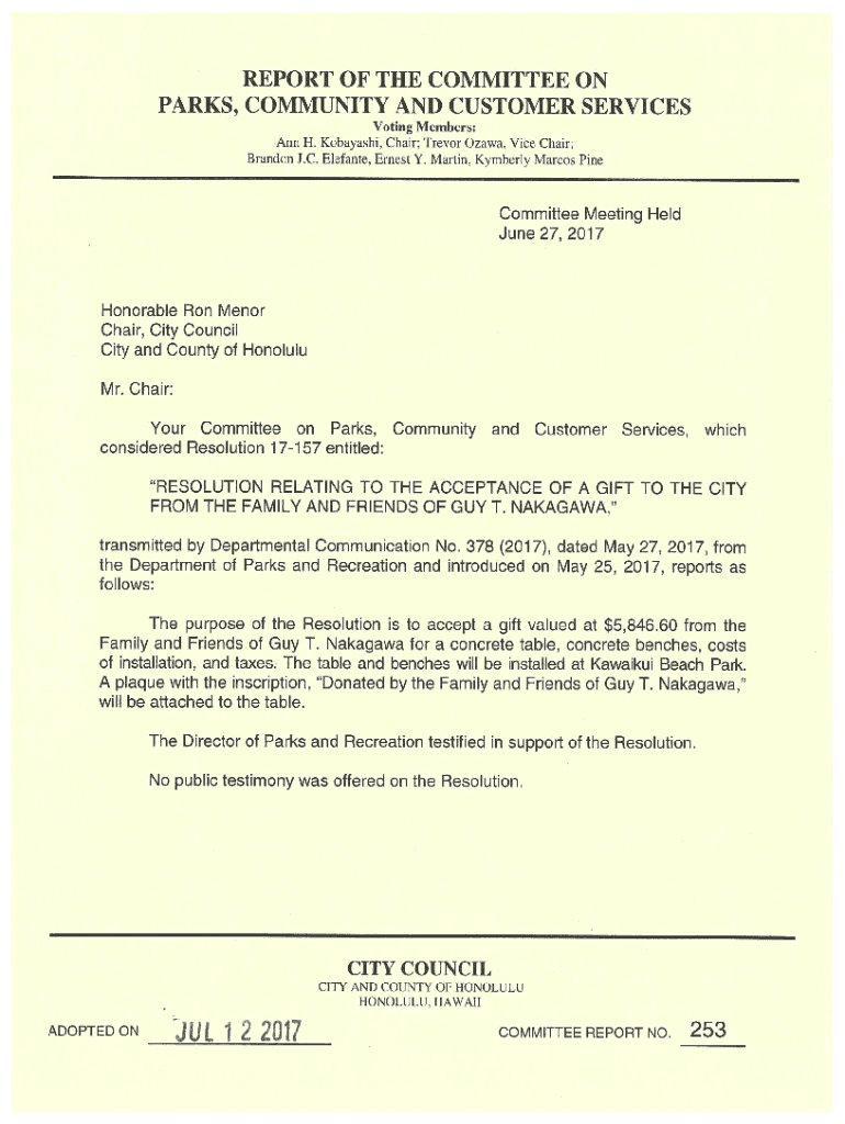 REPORT OF THE COMMITTEE ON PARKS, COMMUNITY AND CUSTOMER SERVICES Voting Members: Ann H. Kobayashi, Chair; Trevor Ottawa, Vice Chair; Brandon J.C. Elephant, Ernest Y. Martin, Kimberly Marcos PineCommittee