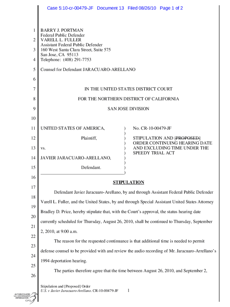 Case 5:10cr00479JF Document 13 Filed 08/26/10-Page 1 of 214BARRY J. PORTMAN Federal Public Defender CARELL L. FULLER Assistant Federal Public Defender 160 West Santa Clara Street, Suite 575 San Jose,