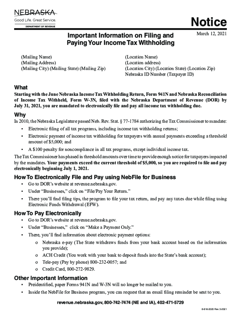 NoticeImportant Information on Filing and Paying Your Income Tax Withholding(Mailing Name)(Mailing Address)(Mailing City) (Mailing State) (Mailing Zip)March 12, 2021(Location Name) (Location address)