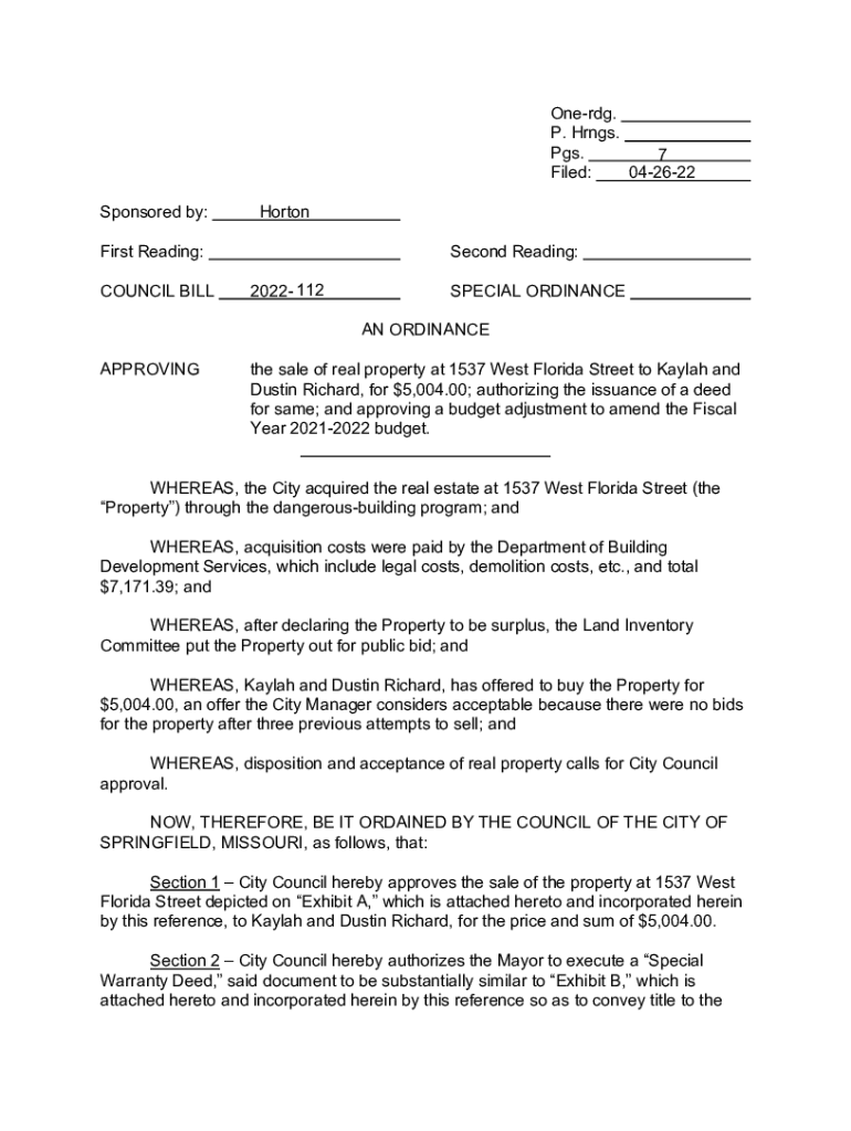 Oneida. P. Hangs. Pgs. 7 Filed: 042622 Sponsored by:HortonFirst Reading: COUNCIL Millisecond Reading: 2022 112SPECIAL ORDINANCE AN ORDINANCEAPPROVINGthe sale of real property at 1537 West Florida