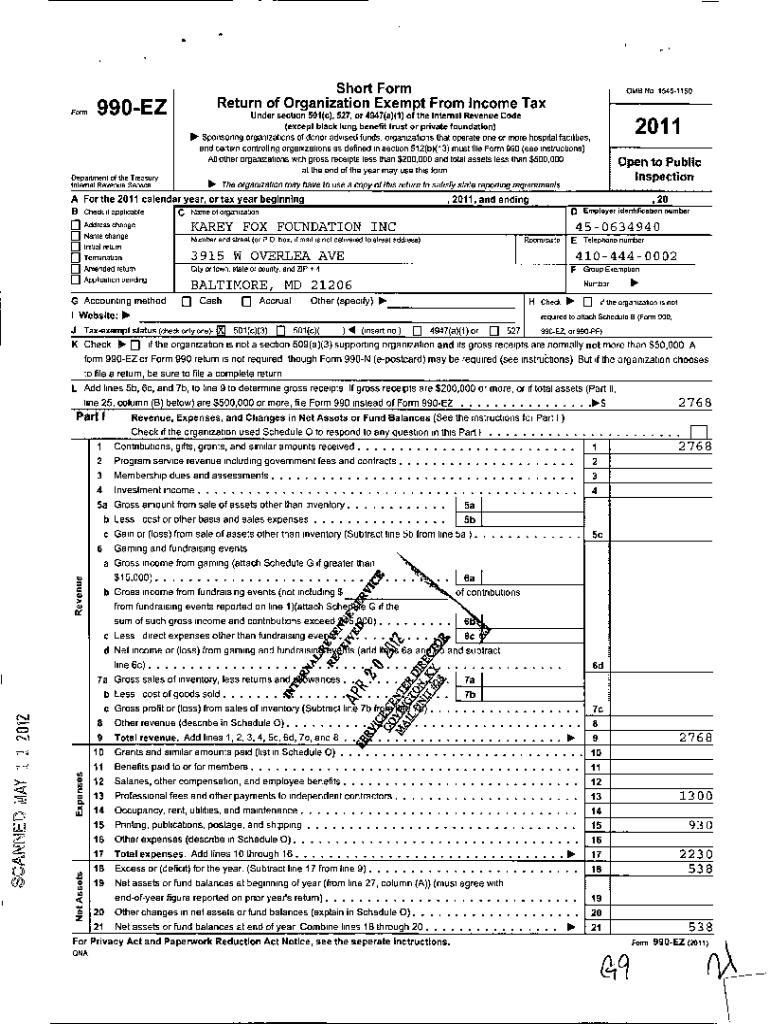 Short Form Return of Organization Exempt From Income Reinform 990EZOMB No 15451150Under section 501(c), 527, or 4947 (a)(1) of the Internal Revenue Code (except black lung benefit trust or private