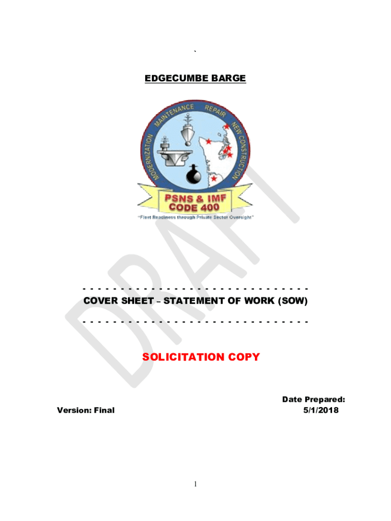 `EDGECUMBE BARGEERRATA One: COVER SHEET STATEMENT OF WORK (SOW) SOLICITATION Copycat Prepared: 5/1/2018 24 June 2008Version: Final1Table of Contents 1.01.1 1.2 1.3 1.4 1.5 1.6 1.7 1.8 1.9 1.10 1.11