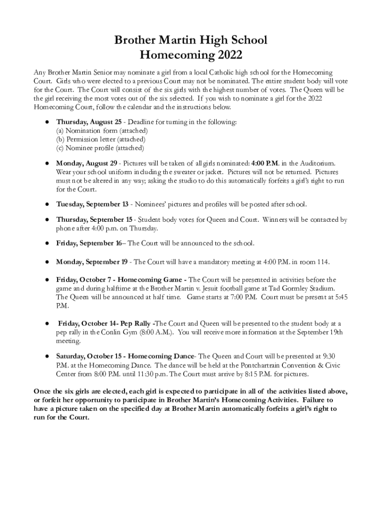 Brother Martin High School Homecoming 2022 Any Brother Martin Senior may nominate a girl from a local Catholic high school for the Homecoming Court. Girls who were elected to a previous Court may
