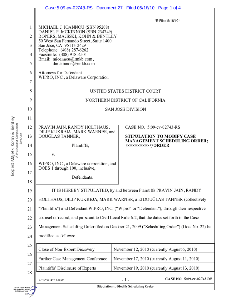 Case 5:09cv02743RS Document 27 Filed 05/18/10-Page 1 of 4 *Filed 5/18/10×1 2 3 4 5 6Attorneys for Defendant CIPRO, INC., a Delaware Corporation8UNITED STATES DISTRICT COURT9NORTHERN DISTRICT OF CALIFORNIA10SAN