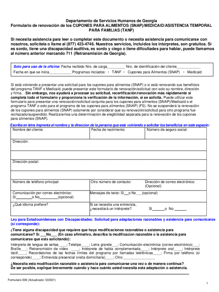Department de Servicios Humans de Georgia Formulation DE renovation de Los CLONES PARA ALIMENTS (SNAP)/MEDICAID/ASISTENCIA TEMPORAL PARA FAMILIES (TANK) Si necessity asistencia para leer o completer