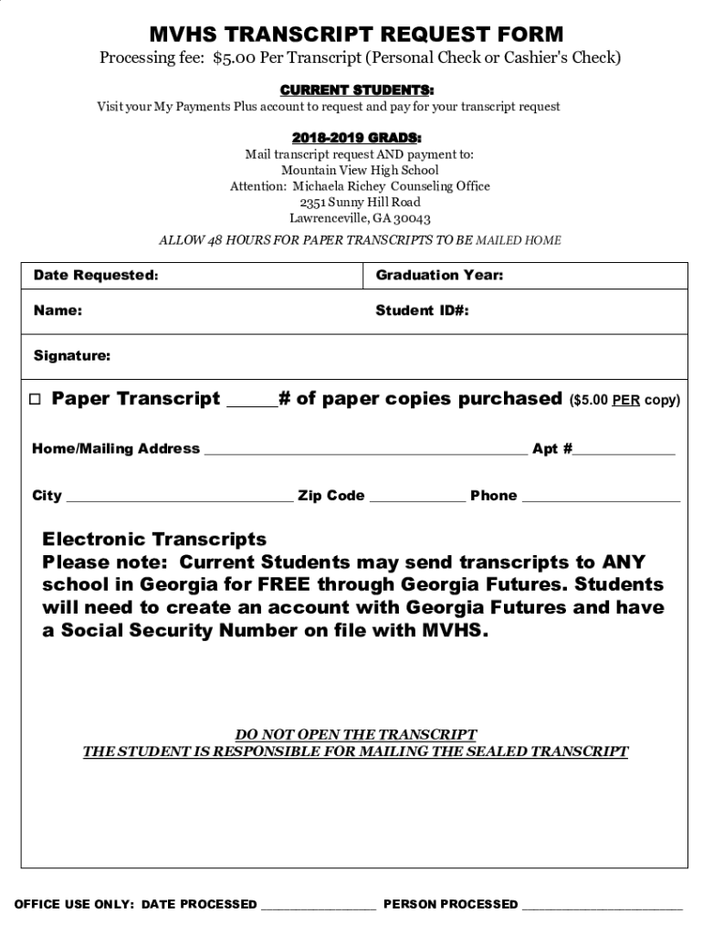 VHS TRANSCRIPT REQUEST Reprocessing fee: $5.00 Per Transcript (Personal Check or Cashier\'s Check) CURRENT STUDENTS: Visit your My Payments Plus account to request and pay for your transcript request