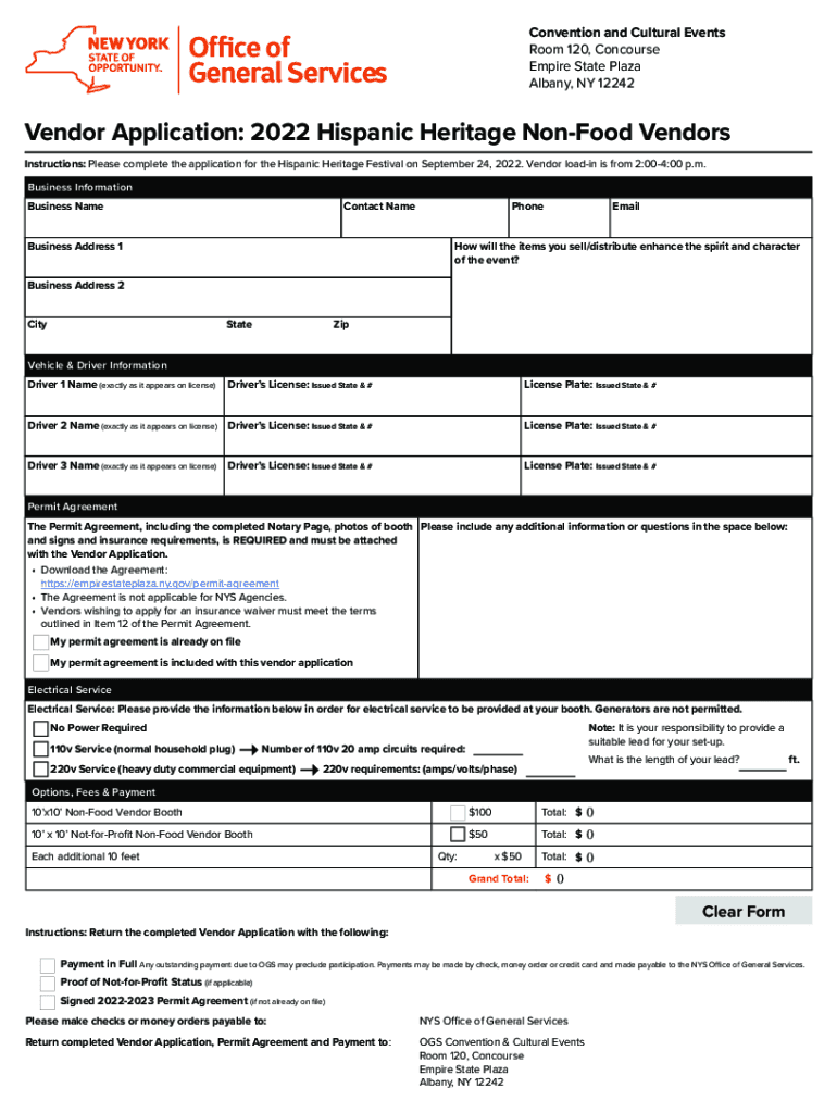 2022 Nonfood Vendor ApplicationHISPANIC HERITAGE CELEBRATION 9.24.22 | 5:00 9:00 PMT thank you for your interest in the New York State Office of General Services (DOGS) 2022 Summer at The Plaza vending