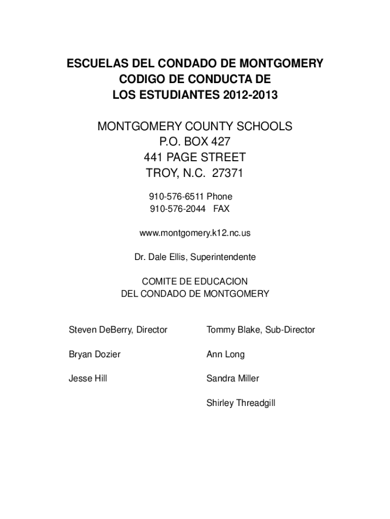 RESCUES DEL CONRAD DE MONTGOMERY CONGO DE CONDUCT DE LOS ESTUDIANTES 20122013 MONTGOMERY COUNTY SCHOOLS P.O. BOX 427 441 PAGE STREET TROY, N.C. 27371 9105766511 Phone 9105762044 FAX www.montgomery.k12.nc.us
