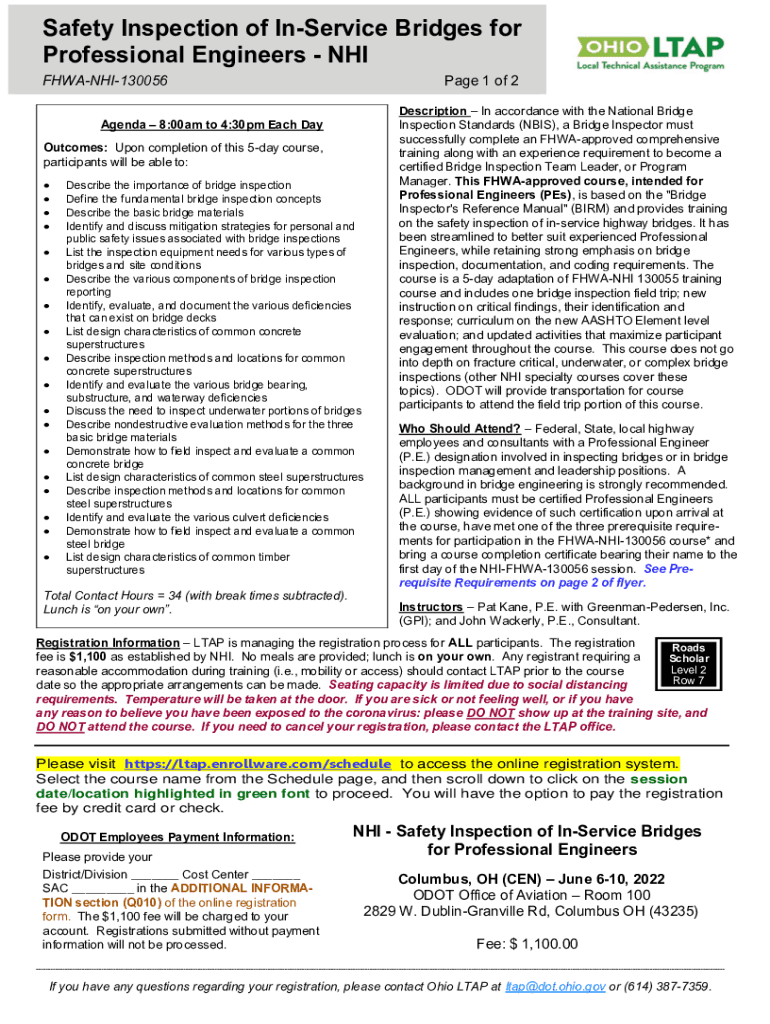 Safety Inspection of In-service Bridges for Professional Engineers NHS FHWANHI130056Page 1 of 2Agenda 8:00am to 4:30pm Each Day Outcomes: Upon completion of this 5day course, participants will be