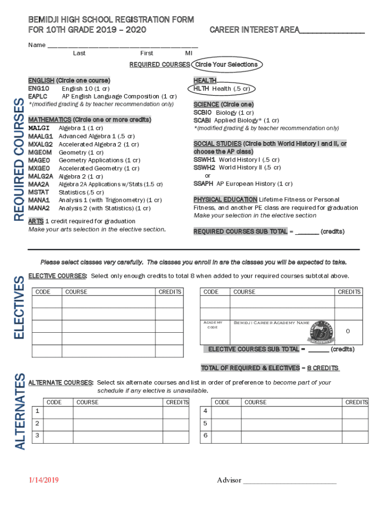 BESIDE HIGH SCHOOL REGISTRATION FORM FOR 10TH GRADE 2019 2020CAREER INTEREST AREA___Name ___ Last First MI REQUIRED COURSES Circle Your Selections ENGLISH (Circle one course) ENG10 English 10 (1 CR)
