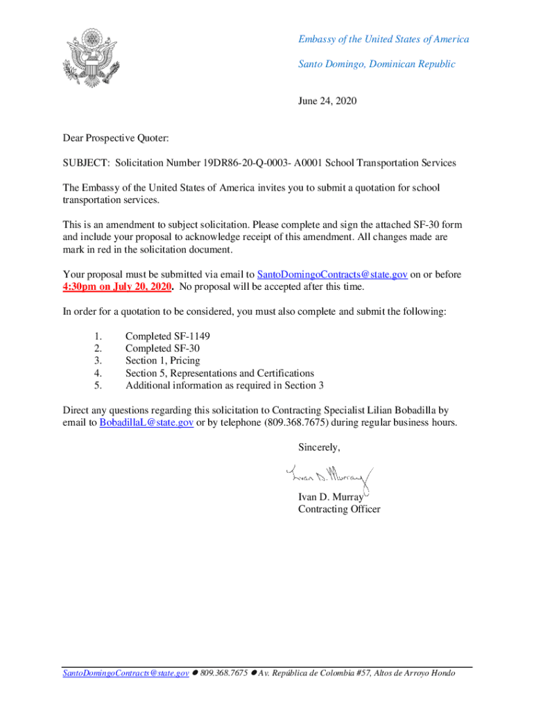 Embassy of the United States of America Santo Domingo, Dominican Republic June 24, 2020Dear Prospective Quoted: SUBJECT: Solicitation Number 19DR8620Q0003 A0001 School Transportation Services The