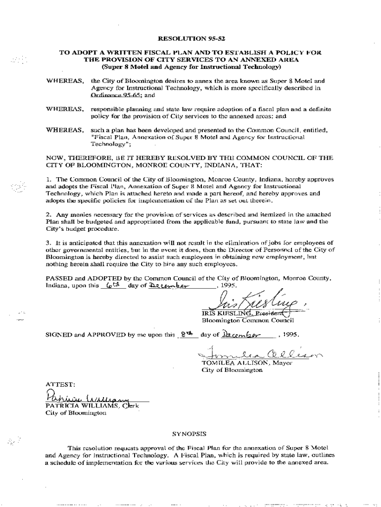 RESOLUTION 9552 TO ADOPT A WRITTEN FISCAL PLAN AND TO ESTABLISH A POLICY FOR THE PROVISION OF CITY SERVICES TO AN ANNEXED AREA (Super 8 Motel and Agency for Instructional Technology) WHEREAS, the