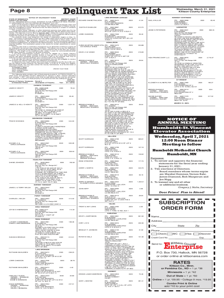Delinquent Tax List Page 8NOTICE OF DELINQUENT TAXES STATE OF MINNESOTA DISTRICT COURT COUNTY OF KITTEN NINTH JUDICIAL DISTRICT TO: ALL PERSONS WITH A LEGAL INTEREST IN THE PARCELS OF REAL PROPERTY