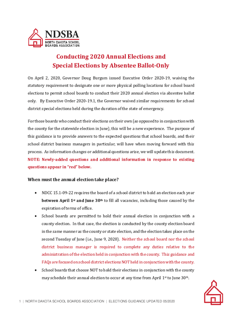 Conducting 2020 Annual Elections and Special Elections by Absentee Balloon On April 2, 2020, Governor Doug Burgum issued Executive Order 202019, waiving the statutory requirement to designate one
